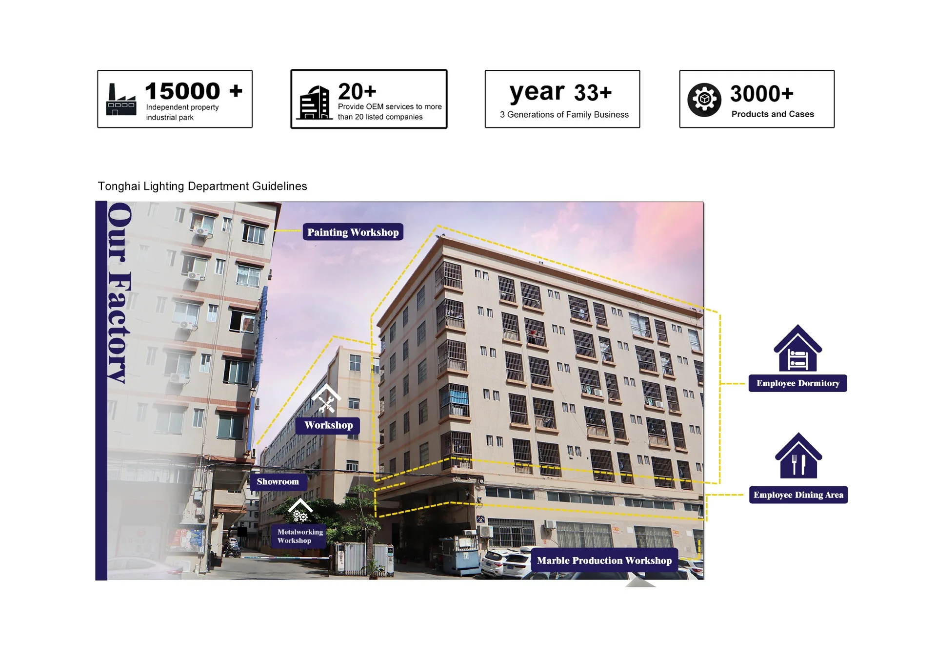 Tonghai Lighting is a family lighting enterprise that started manufacturing lighting fixtures in 1993. For over 30 years, we have been dedicated to the research and development, production, and sales of home lighting, commercial lighting, and engineering customization. After more than 30 years of effort, we have three self built factories with an area of 150000 square meters. In order to maintain long-term stable production, more than 100 employees have been hired. The company has independent and mature independent development capabilities and complete modern mechanical production supporting equipment, implementing a large-scale, standardized, and industrialized production model, and outsourcing the production of well-known domestic lighting brands. The product sells well both domestically and internationally. Passed quality management system certifications such as 1S09001, CCC, CE, ETC, etc.